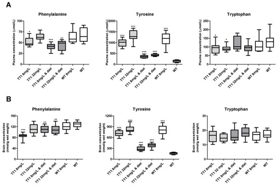 - Van Ginkel, W.G.; van Vliet, D.; Burgerhof, J.G.M.; de Blaauw, P.; Rubio Gozalbo, M.E.; Heiner-Fokkema, M.R.; van Spronsen, F.J. Presumptive Brain Influx of Large Neutral Amino Acids and the Effect of Phenylalanine Supplementation in Patients with Tyrosinemia Type 1. PLoS ONE 2017, 12, e0185342. [Google Scholar] [CrossRef]