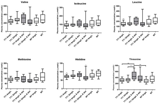 - Van Vliet, D.; Bruinenberg, V.M.; Mazzola, P.N.; van Faassen, M.H.; de Blaauw, P.; Kema, I.P.; Heiner-Fokkema, M.R.; van Anholt, R.D.; van der Zee, E.A.; van Spronsen, F.J. Large Neutral Amino Acid Supplementation Exerts its Effect through Three Synergistic Mechanisms: Proof of Principle in Phenylketonuria Mice. PLoS ONE 2015, 10, e0143833. [Google Scholar] [CrossRef]