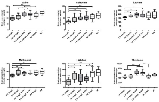 - Vogel, K.R.; Arning, E.; Wasek, B.L.; McPherson, S.; Bottiglieri, T.; Gibson, K.M. Brain-Blood Amino Acid Correlates Following Protein Restriction in Murine Maple Syrup Urine Disease. Orphanet J. Rare Dis. 2014, 9, 73. [Google Scholar] [CrossRef]