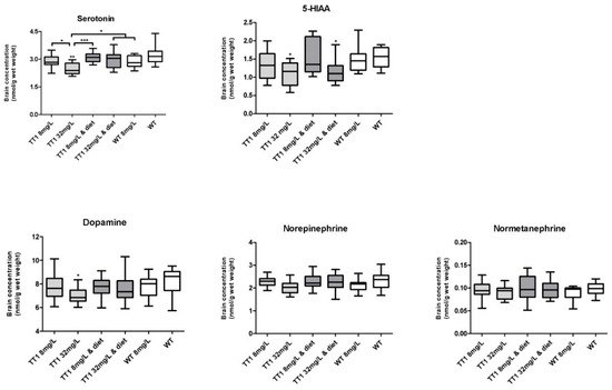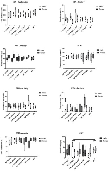 - Bruinenberg, V.M.; van der Goot, E.; van Vliet, D.; de Groot, M.J.; Mazzola, P.N.; Heiner-Fokkema, M.R.; van Faassen, M.; van Spronsen, F.J.; van der Zee, E.A. The Behavioral Consequence of Phenylketonuria in Mice Depends on the Genetic Background. Front. Behav. Neurosci. 2016, 10, 233. [Google Scholar] [CrossRef]