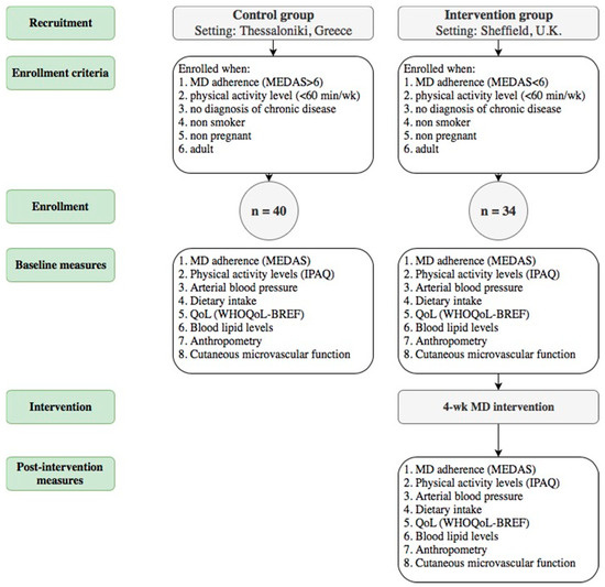 A flowchart of the recruitment, screening and study procedures performed in each group is presented in Figure 1. Following the provision of written consent, controls were invited to the Medical School, Faculty of Health Sciences of the Aristotle University of Thessaloniki for a single, 70-min session. In parallel, screening for participation in the intervention group took place at the Centre for Sport and Exercise Science of Sheffield Hallam University for an identical set of baseline assessments. The intervention group then followed the MD for four weeks, after which, all measurements were repeated. Participants in both groups were asked to refrain from drinking caffeinated drinks for a period of three hours prior to the assessments.