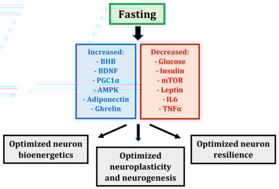 Fasting influences fat metabolism by altering the hormonal activities of leptin, adiponectin, and ghrelin [,,]. Leptin is associated with a pro-inflammatory state, whereas adiponectin is associated with enhanced insulin sensitivity and suppressed inflammation []. Ghrelin is also associated with enhanced insulin sensitivity []; moreover, ghrelin may stimulate hippocampal synaptic plasticity and neurogenesis []. Fasting decreases leptin but increases adiponectin and ghrelin, alterations that are probably beneficial for neuron bioenergetics and the maintenance of neural pathways.