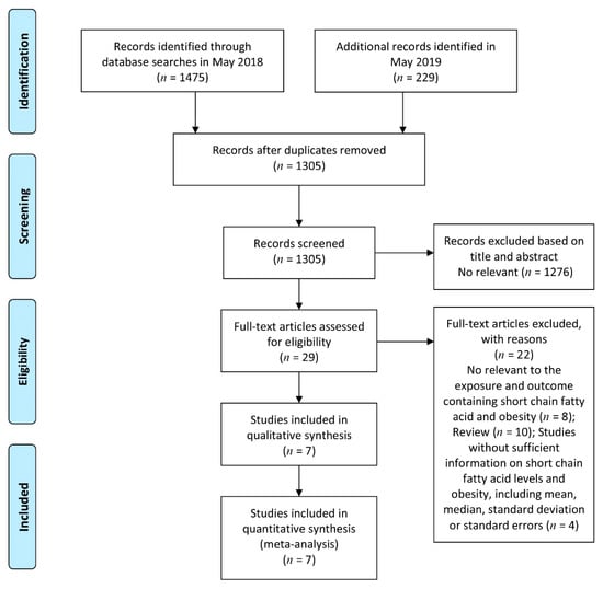 Figure 1 shows the details of the study selection process. Briefly, we identified 29 potentially relevant articles on SCFAs in relation to obesity. The interrater reliability of the two reviewers for the initial screening of the study selection was moderate (agreement 86.75%, κ = 0.19). After we further examined the 29 identified articles, 22 articles were excluded (Supplementary Table S2). Finally, we identified seven articles that met the inclusion criteria [8,9,10,11,13,24,25]. The overall quality of the studies averaged eight stars (range, 7–9) on a scale from zero to nine stars (Supplementary Table S3).
