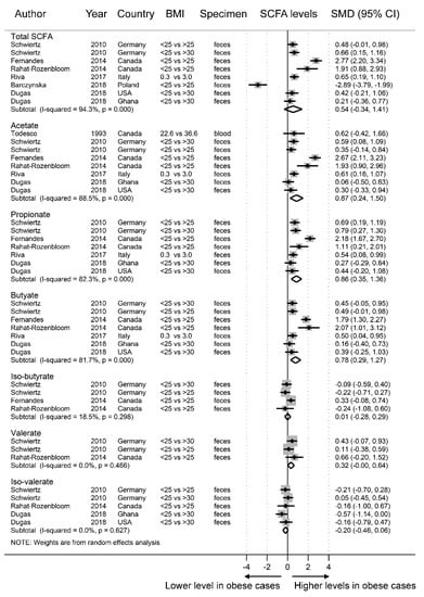 Therefore, the main objective of the current meta-analysis based on previous human studies was to investigate whether SCFA levels in obese individuals differ from those in nonobese individuals. The secondary objective of this study was to determine whether the fecal microbiota abundance in obese and nonobese individuals reported in the literature on the relationship between SCFAs and obesity is different.