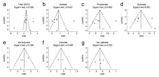 Figure 3 shows that there was no evidence of funnel plot asymmetry. In addition, Egger’s test indicated no publication bias in total SCFAs (p = 0.580), acetate (p = 0.621), propionate (p = 0.580), butyrate (p = 0.587), iso-butyrate (p = 0.380), valerate (p = 0.495), and iso-valerate (p = 0.783).