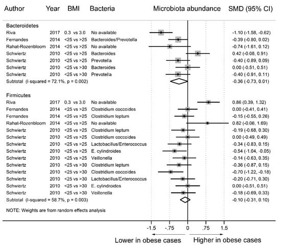 As Figure 5 shows, fecal microbiota analyses were conducted in four studies [8,9,10,13] with 21 datasets. In the stratification by phylum, we identified seven datasets for Bacteroidetes and 14 datasets for Firmicutes. Compared to the nonobese group, the abundance of Bacteroidetes (SMD = −0.36, 95% CI = −0.73–0.01) and Firmicutes (SMD = −0.10, 95% CI = −0.31–0.10) was decreased in the obese group, but the difference was not statistically significant. Statistically significant heterogeneity was found among the studies of Bacteroidetes (I2 = 72.1%) and Firmicutes (I2 = 58.7%). Supplementary Figure S2 shows no evidence of funnel plot asymmetry in Egger’s test (Bacteroidetes, p = 0.833; Firmicutes, p = 0.636).