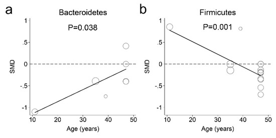 The estimated SMD of phylum Firmicutes decreased from 0.779 to 0.221 for participants aged 11 to 37 years. The estimated SMD of Firumicutes decreased −0.007 to −0.269 for participants aged 38 to 47 years. The meta-regression analyses of the studies suggested that age was a possible source of heterogeneity.