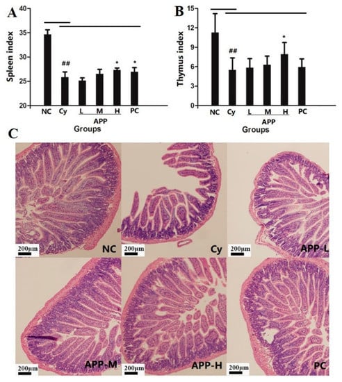The thymus index and spleen index could reflect the capacity of immunity []. As shown in Figure 1A,B, the spleen index and thymus index of the Cy group were significantly lower than those in NC group (p < 0.01), which suggested that Cy had an effect on the weight reduction of immune organs. The APP-H group can improve the spleen index and thymus index in immunocompromised mice induced by Cy (p < 0.05); however they were not up to the normal level, which indicated that APP could improve the immune organ index of mice with low immunity but cannot reverse the atrophy of thymus and spleen. The results were consistent with the previous study []. It was reported that many bioactive substances can enhance the immunity by increasing the organ index, such as pineal peptide, collagen peptide from jelly fish, and squid ink polysaccharide [,,].