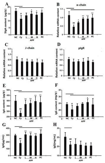 It had been supposed that APP significantly increase the secretion of SIgA in immunocompromised mice. In order to further explore the mechanism of APP to promote the secretion of SIgA, the effects of three components of SIgA (α-chain (IgA), J-chain and pIgR) were further studied. There were no significant differences in the relative level of J-chain and pIgR among different groups (in Figure 2C,D), which indicated that Cy and APP have no significant effect on J-chain and pIgR. As shown in Figure 2B, compared with Cy group, the relative level of α-chain (IgA) in APP-L group was increased (p < 0.05), and that in APP-M, APP-H group, and PC group was significantly improved (p < 0.01). The results showed that APP can significantly improve the relative level of IgA and this is also consistent with the results about the increased content of SIgA which can be formed by IgA. The similar researches had supported that significant increase of IgA secretion in the lamina propria of the small intestine played an important role on improvement of intestinal immune function [].