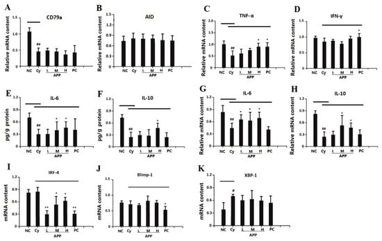 Effects of APP on the factors in the differentiation of IgA+ B cell and effect on plasma cell differentiation. CD79a mRNA level (A) and AID mRNA level (B) are the factors in the early differentiation of IgA+ B cell. TNF-α mRNA level (C) and IFN-γ mRNA level (D) are the factors in the medium-term differentiation of IgA+ B cell. IL-6 protein expression (E), IL-10 protein expression (F), IL-6 mRNA level (G) and IL-10 mRNA level (H) are the factors in the final differentiation of IgA+ B cell. IRF-4 (I), Blimp-1 (J), and XBP-1 (K) are the transcription factors in plasma cells. Values are expressed as mean ± SD, n = 10. The different symbols indicate significant differences (# p < 0.05, ## p < 0.01 compared to the NC group; * p < 0.05, ** p < 0.01 compared to the cyclophosphamide (Cy) group).
