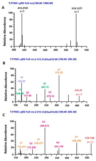 It can be seen in Figure 5A, the exact molecular weights of the two peaks with the highest response values in the peak D peptide were 415.2 and 519.1 respectively. The two peaks were subjected to two-stage mass spectrometry using Nano-ESI-Ms/Ms as shown in Figure 5B,C. The composition had an exact molecular weight of 415.2 Da, which was a tetrapeptide, and its sequence was Gly–Val–Ile–Lys with the spleen lymphocyte proliferation rate of 30.12% at 20 μg/mL. The other peptide is pentapeptide, and its sequence is Ala–Cys–Asn–Gly–Arg with spleen lymphocyte proliferation rate of 29.72% at 20 μg/mL. Active peptide extracted from milk with the sequence of Thr–Thr–Met–Pro–Leu–Trp and Val–Arg–Gly–Pro–Phe–Pro–Ile–Val, which showed strong immunological activity in vitro [,]. Peptide with high immune activitity was isolated from rice with a sequence of Gly–Tyr–Pro–Met–Tyr–Pro–Leu–Pro–Arg []. The pure peptide that was identified have the high immunity maybe could promote the secretion of SIgA on the small intestinal mucosa, and improve the immunity on small intestinal mucosa.