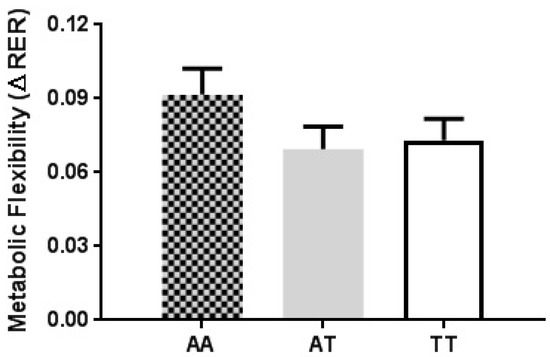 Metabolic flexibility (∆RER) was similar among FTO genotypes (p = 0.299) (Figure 1). The absence of an effect of BMI (p = 0.32, R2 = 0.043) and gender (p = 0.357, R2 = 0.040) on metabolic flexibility response between FTO genotypes was confirmed by ANCOVA. When observing the influence of BMI regardless of FTO genotype, metabolic flexibility (∆RER) was found to be significantly slower in overweight individuals (BMI ≥ 25 kg/m2) than lean individuals (BMI ≤ 24.9 kg/m2) (p = 0.009).