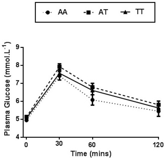 No genotype main effect (p = 0.114) or genotype by time interaction (p = 0.427) was identified for plasma glucose (Figure 2). Plasma glucose concentrations remained similar between FTO genotypes when adjusting for BMI and gender (p > 0.05) (Table S1).