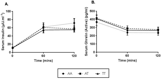 No genotype main effect (SI, p = 0.439; SG, p = 0.626), or genotype by time interaction (SI, p = 0.330; SG, p = 0.979) was identified for serum insulin (Figure 3A) and serum ghrelin concentrations (Figure 3B). When adjusted for BMI and gender, serum insulin and ghrelin concentrations remained similar between FTO genotypes (p > 0.05) (Table S1).