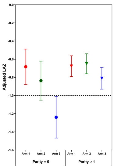 Adjusted mean (95% confidence interval) length-for-age z-scores (LAZ) of neonatal outcomes by treatment arm and parity. Horizontal line at LAZ −1 depicts a length deficit that has predicted a high risk of stunting at two years. Circles indicate parity = 0; Triangles indicate parity ≥1.