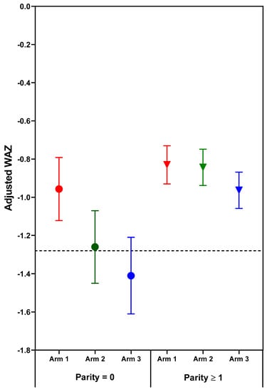 Adjusted mean (95% confidence interval) weight-for-age z-scores (WAZ) of neonatal outcomes by treatment arm and parity. Horizontal line at WAZ −1.28 corresponds to the 10th% WAZ (small-for-gestational age). Circles indicate parity = 0; Triangles indicate parity ≥1.