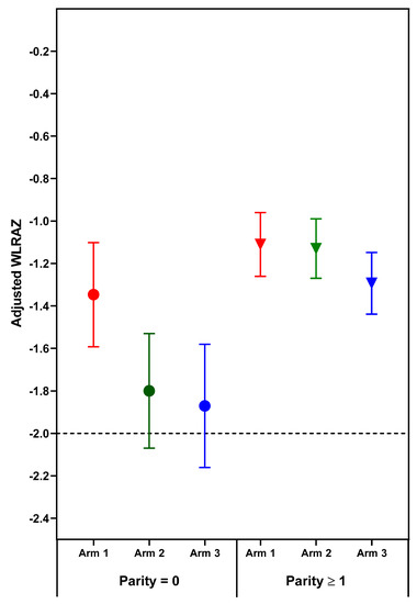 Adjusted mean (95% confidence interval) weight to length ratio-for-age z-scores (WLRAZ) of neonatal outcomes by treatment arm and parity. Horizontal line at WLRAZ −2 depicts weight to length deficit for diagnosis of wasting. Circles indicate parity = 0; Triangles indicate parity ≥1.