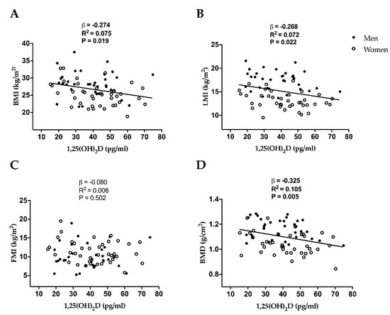 Simple linear regression graphs between 1,25-Dihydroxyvitamin D (1,25(OH)2D) and body mass index (BMI) (A), lean mass index (LMI) (B), fat mass index (FMI) (C), and bone mineral density (BMD) (D) in middle-aged sedentary adults. β (standardized regression coefficient), R2, and P from a simple linear regression analysis.
