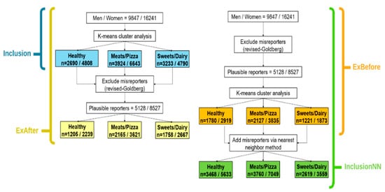 k-means cluster analyses [] were performed to characterize dietary patterns. Individuals whose EI was determined to be affected by misestimation (EI under-reporters and over-reporters, henceforth collectively grouped as EI misreporters because over—reporters comprised only 1% of the study sample—and could not be assessed separately) were accounted for in the cluster analyses using four methods: included in the cluster analysis (Inclusion); excluded prior to completing the cluster analysis (ExBefore); excluded after completing the cluster analysis (ExAfter); and finally, excluded before the cluster analysis but added to the ExBefore cluster solution using the nearest neighbour method (Inclusion-NN) [] (Figure 1). The nearest neighbour method (k = 1) is a pattern classification method that measures the Euclidean distance between a test example (i.e., participant) and the data set and assigns the test example to the cluster of the nearest neighbour [].