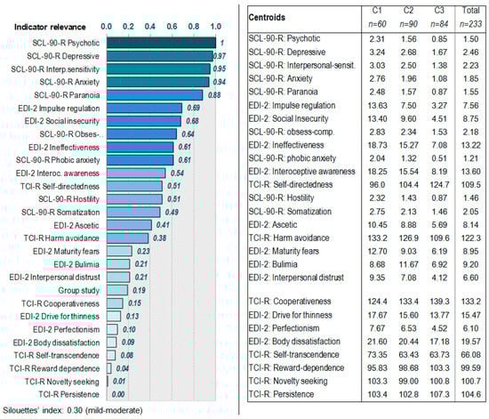 Figure 1 summarizes the results of the clustering procedure: the bar-graph with the indicator relevance for each variable (which reports how good each variable was for the grouping and can differentiate between the derived clusters: the higher the importance of the measure, the less likely it is that the variation for the variable between clusters is due to chance and the more likely it is due to underlying differences) and the centroids (which summarizes the cluster patterns for the set of variables and allows clinical interpretation of the empirical clusters). The indicator variables with the highest contribution into the clustering were SCL-90-R scales measuring the symptom levels (concretely psychotic, depressive, interpersonal sensitivity, anxiety, paranoia), followed by the EDI-2 scales measuring ED severity (impulse regulation, social insecurity, and ineffectiveness). The personality traits measured with the TCI-R obtained low relevance for the clustering, except for harm avoidance (which achieved moderate-low capacity), as well as the diagnostic subtype (which achieved poor capacity for the differentiation between the groups).