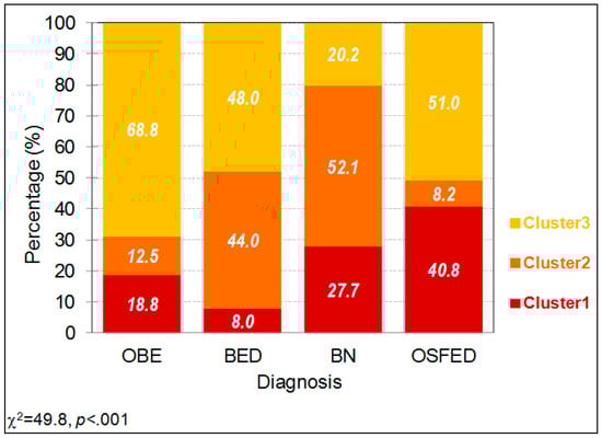 Figure 2 includes the 100%-stacked bar chart with the distribution of the DSM-5 ED diagnostic subtype into each empirical cluster. OBE patients were primary included into cluster 3 (68.85), while BED patients were mostly distributed into clusters 3 and 2 (48.0% and 44.0%, respectively). Approximately half of the BN patients were into cluster 2 (52.1%), and the remaining participants into this group were distributed between cluster 1 (27.7%) and cluster 3 (20.2%). A little more than half of the OSFED patients were in cluster 3 (51%), and almost 41% in cluster 1.