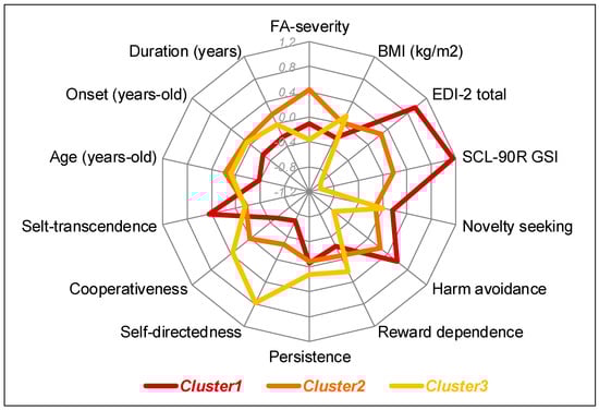 As a synthesis of the results, Figure 3 contains the radar-chart comparing the empirical clusters for the main clinical variables of the study. To allow adequate interpretability, z-standardized scores were plotted.