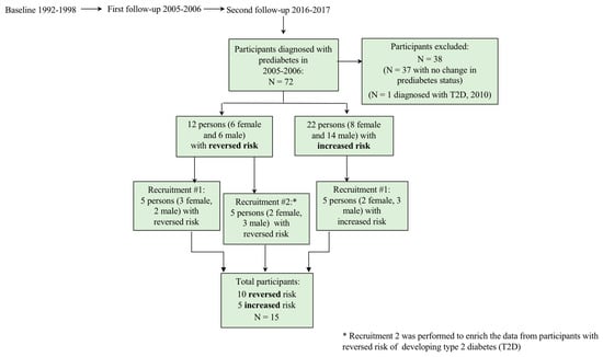 The qualitative study was conceptualized by the authors HMA, LT, AL, and C-GÖ, and the reporting followed the consolidated criteria for reporting qualitative research (COREQ) guidelines []. Purposive sampling was used to identify study participants who had a high risk of developing T2D between the first and second follow up examinations. A set of predefined criteria ensured the selection of participants with experience of living at risk of developing T2D for as long a time period as possible. All participants included in the study had a family history of diabetes (FHD), which was assumed to be a contributing factor to knowledge on diabetes and diabetes risk awareness. Only participants with either reversed or progressed prediabetes at the second follow up were included in order to have the opportunity to compare potential lifestyle changes between the participant groups. The inclusion criteria were as follows: (1) enrolment in the baseline study from 1994–1996; (2) informed about prediabetes status in the first follow-up period (2005–2006); (3) FHD; and (4) completion of the 20-year follow-up at least three months before the qualitative interview was conducted. The exclusion criteria were as follows: (1) stable glucose values at the first and second follow up points and (2) T2D diagnosis before the second follow up (see Figure 1).