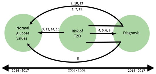 Fifteen participants were at risk of developing type 2 diabetes (T2D) at the first follow up (2005–2006). At the second follow up (2016–2017), four of the participants (4, 5, 6, and 9) had progressed in their prediabetes status towards a T2D diagnosis. One of the participants from the group with elevated glucose values (8) interpreted the information on glucose levels as diabetic values and managed to reverse the risk to normal values. Ten participants had reversed their risk, and three participants (2, 10, and 13) had reversed their risk after receiving another diagnosis than T2D. Three participants (1, 7, 11) could have reversed their risk because of their partners’ diagnoses that indirectly led to changes in the diets of the participants. One participant with progressed prediabetes (9) had a partner with a diabetes diagnosis but did not report on specific dietary changes other than eating less due to ageing (see Figure 2).