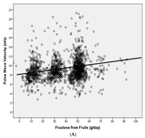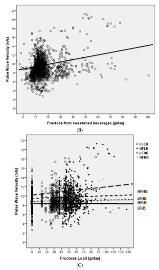 Regression graph plotting (A) cfPWV vs. fructose derived from fruits in the whole population sample, (B) cfPWV vs. fructose derived from sweetened beverages in the whole population sample and, (C) cfPWV vs fructose load in subjects consuming low fructose quantity, high fructose quantity from fruits, high fructose quantity by sugar-sweetened beverages or high fructose quantity from both sources.