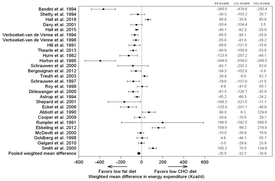 Outpatient studies comparing the effects on energy expenditure of isocaloric diets with a constant protein intake have yielded varied results. In general, meta-analyses reflect statistically, but probably not physiologically, significantly different dietary fat and carbohydrate effects (Figure 3) [32].