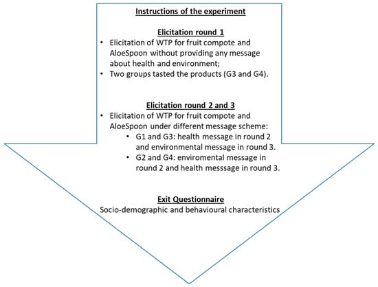 The framing of the experiment in its timeline is illustrated in Figure 1. Following Castellari et al. [44], after providing instructions for the experiment, the first section of WTP elicitation was carried out without any message related to the health or environmental benefits of Aloe vera. For this first round, instructions about the experiment were given, with only a few indications describing each product which were basically focused on the composition of the fruit compote.