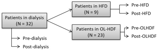 This cross-sectional study included 32 dialysis-dependent patients with CKD recruited to the dialysis service of the Hospital Universitario 12 de Octubre (Madrid, Spain). Of these subjects, 9 patients were treated with conventional HFD and 23 were treated with OL-HDF. Figure 1 shows the flow-chart of patient selection and sample recruitment. Causes of renal failure were as follows: chronic glomerulonephritis (21.9%), diabetic nephropathy (15.6%), polycystic kidney disease (12.5%), interstitial nephritis (9.4%), atypical hemolytic uremic syndrome (6.3%), malignant hypertension (6.3%), nephroangiosclerosis (6.3%), ischemic nephropathy (3.1%), and others (18.8%). Subjects underwent clinical examinations before dialysis and blood analysis before (pre-) and after (post-) one dialysis session. Blood samples were collected in EDTA or heparin tubes and immediately centrifuged at 2000 rpm for 10 min. Plasma samples were stored at −80 °C until use. All patients signed an informed consent. The study was approved by the local ethics committee of Hospital Universitario 12 de Octubre (CEI: 16/250) in compliance with the recommendations of the Declaration of Helsinki.