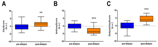 OxyScore, AntioxyScore, and DialysisOxyScore in pre- and post-dialysis stages. (A) OxyScore, (B) AntioxyScore, and (C) DialysisOxyScore in dialysis patients. Data is presented as median ± interquartile range. ** p < 0.01 and *** p < 0.001 vs. pre-dialysis.