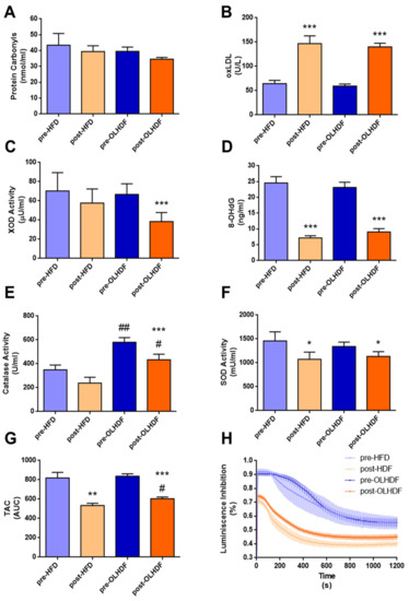 Markers of oxidative damage (A–D) and antioxidant defense (E–H) in HFD and OL-HDF dialysis patients pre- and post-dialysis. (A) Protein carbonyls, (B) oxidized LDL (oxLDL), (C) xanthine oxidase (XOD) activity, (D) 8-hydroxy-2′-deoxyguanosine (8-OHdG), (E) catalase activity, (F) superoxide (SOD) activity, (G) total antioxidant capacity (TAC) measured as AUC, and (H) TAC variation in luminescence inhibition after plasma addition (time = 1 s). Data is presented as mean ± SEM. Blue bars represent data of pre-dialysis samples, clear blue for HFD, and dark blue for OL-HDF. Orange bars represent data of post-dialysis samples, clear orange for HDF, and dark orange for OL-HDF. * p < 0.05 ** p < 0.01 and *** p < 0.001 vs. pre-dialysis situation; # p < 0.05 and ## p < 0.01 vs. HFD.
