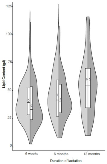 Distribution of total lipid content concentrations (g/L) of human milk samples at 6 weeks, 6 months, and 12 months of lactation. Shaded areas show split violin plots of the density function with inserted boxes indicating the first and third quartile and the median and with inserted ◊ indicating the arithmetic mean. ◊ Arithmetic mean lipid content of given sample si Total sample size