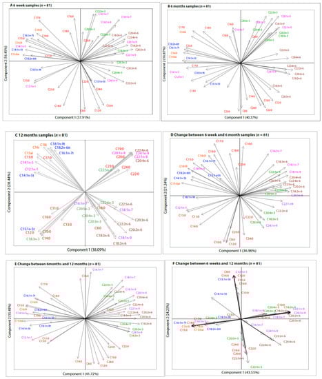 Compositional biplots from principal component analysis (PCA) of centered log-ratio transformed fatty acid concentrations of human milk samples collected at 6 weeks, 6 months, and 12 months (n = 81). Colour Key: Red—Saturated fatty acids; Blue—Trans-fatty acids; Green—Omega-3 fatty acids; Pink—Monounsaturated fatty acids; Orange—Branched-chain fatty acids. Compositional biplots of fatty acids analyzed in human milk samples collected at (A) 6 weeks; (B) 6 months; (C) 12 months. Compositional biplots of changes in fatty acid composition between (D) 6 weeks and 6 months; (E) 6 months and 12 months (F) 6 weeks and 12 months.