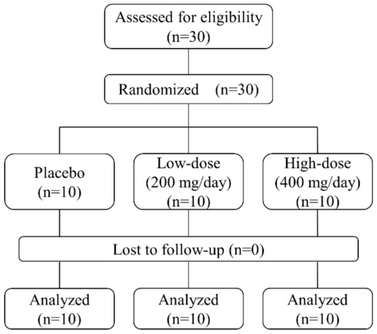 We conducted a randomized, double-blind, placebo-controlled study at the Menopause Clinic of Tokyo Medical and Dental University Hospital. The study participants included prehypertensive Japanese men and women aged 40–64 years old and were recruited via a research support agency (Pacific Grove, Tokyo, Japan). Prehypertension was defined as systolic BP (SBP) of 130–139 mmHg and/or diastolic BP (DBP) of 85–89 mmHg, according to the 2014 diagnostic criteria of the Japanese Society of Hypertension. The study participants had been diagnosed with prehypertension in their most recent medical checkup. Those who had been treated for non-communicable diseases (e.g., hypertension, dyslipidemia, and diabetes) were excluded prior to study enrollment by the research support agency. The study sponsor (Kikkoman Biochemifa Company, Tokyo, Japan) randomly assigned the participants to the study groups and provided the GSPE tablets (Gravinol™). The participants were randomized to receive GSPE tablets that contained either low-dose (200 mg/day, n = 10) or high-dose (400 mg/day, n = 10) proanthocyanidin, or placebo (n = 10), for 12 weeks (Figure 1). Each group comprised 2 men and 8 women. Both investigators and participants were blinded to study group assignments. The GSPE tablets contained concentrated proanthocyanidin (~85%) and flavan-3-ol monomers such as catechin, epicatechin, and epicatechin gallate. The low- and high-dose GSPE and placebo tablets (Kikkoman Biochemifa Company, Tokyo, Japan) were indistinguishable in shape, weight, and color. The participants were instructed to take four tablets per day at any time of the day. Each tablet contained 100, 50, or 0 mg of GSPE for the high-dose, low-dose, and placebo groups, respectively. Participants underwent a series of examinations before and after 4, 8, and 12 weeks of treatment and were checked for adherence. We regarded a tablet intake of <75% as therapeutic noncompliance.