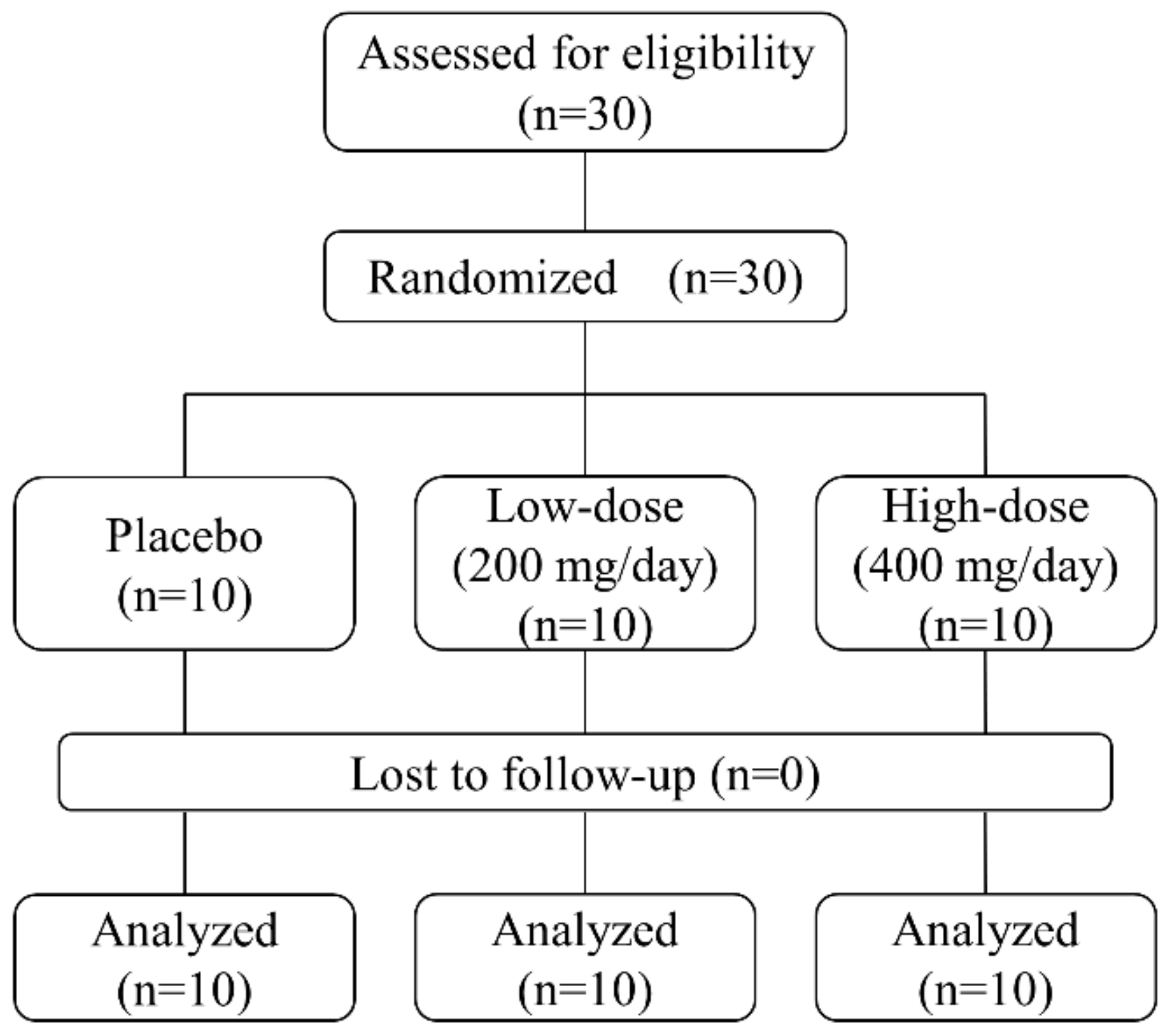 | Placebo (n = 10) | Low Dose (n = 10) | High Dose (n = 10) | Pc | |||||||||