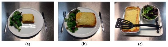 Lasagna served in Study 2: (a) Smaller portion size (180 g cooked lasagna, 292 kcal); (b) larger portion size (540 g cooked lasagna, 875 kcal); and (c) family-sized lasagna (978 g cooked lasagna, 1584 kcal).