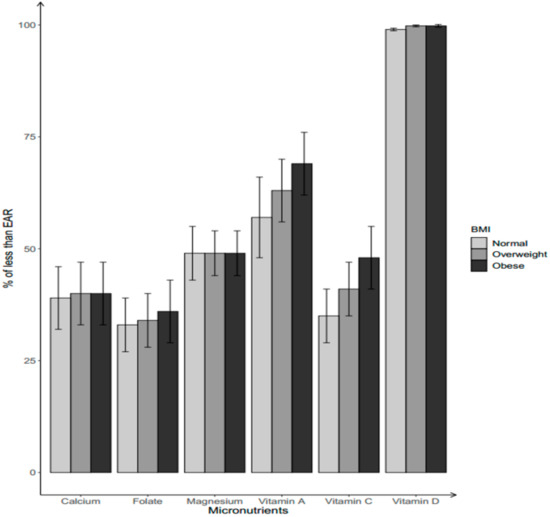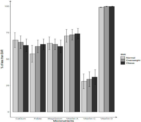 Similarly, the usual dietary intakes of micronutrients and micronutrient adequacies were estimated by BMI status among non-Hispanic White women aged 19–39 years (Table S1 and Figure S1). Usual dietary intakes for vitamins A, B2, B6, and C, folate, magnesium, copper, and iron were significantly different by BMI status (p ≤ 0.05), with the lowest intakes for those micronutrients in the obese group. Obese women had the highest prevalence of in adequacy for vitamins A and C, folate, calcium and magnesium, followed by overweight and normal/under-weight women. Close to 100% of non-Hispanic White women had dietary vitamin D intake below the EAR in all BMI groups.
