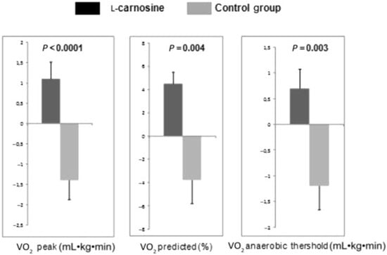 Six months of supplementation with 500 mg L-Carnosine daily increased VO2 (mL/kg/min), percent predicted peak VO2(%), and VO2 at the anaerobic threshold (mL/kg/min) versus standard treatment in 50 patients with HFrEF. Used with permission by Lombardi et al. [].
