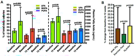 Although a low-fat diet has been long favored in the prevention and treatment of CVD, a diet high in unsaturated fatty acids (UFA) may hold far more cardioprotective benefit []. A cross-sectional analysis of 23 subjects with HFpEF and obesity demonstrated that consumption of mono- and polyunsaturated fatty acids (MUFA and PUFA, respectively) was positively correlated with relative peak VO2 []. This relationship was strengthened when these fatty acids were combined and expressed as total consumption of UFA in grams, as well as in percentage of total calories []. Saturated fatty acids were initially also associated with peak VO2, but the relationship disappeared upon multivariate analysis when both UFA and saturated fatty acids were included []. Dietary sugars were also analyzed and found to be inversely correlated with peak VO2 []. Additionally, UFA consumption was associated with better diastolic function on echocardiogram, as well as greater FFM percentage of body weight and a better FFM to FM ratio on bioelectrical impedance analysis []. In the UFA-Preserved pilot trial, nine subjects with HFpEF and obesity supplemented their diet with UFA-rich foods (including extra-virgin olive oil, canola oil, unsalted or lightly salted mixed nuts, seeds, avocado, and fatty fish) for 12 weeks with baseline dietary counseling and weekly phone call reinforcement by a dietitian []. There was no ET included as part of the intervention []. After 12 weeks, subjects had a significant increase in UFA plasma biomarkers and reported increased intake of UFA on 24-h dietary recall (Figure 2A) []. Subjects demonstrated a trend towards improving their peak VO2 on treadmill CPET, which was associated, though non-significantly, with changes in plasma UFA, as well as MUFA and PUFA individually (Figure 2B) []. Whether these beneficial effects translate into improvements in clinical outcomes, as well as CRF in a larger sample size, is unknown and requires further work. Currently, the follow-up randomized controlled trial (UFA-Preserved2) is ongoing (NCT03966755) and examining the effect of daily UFA supplementation versus standard of care dietary recommendations (controlling sodium and saturated fatty acids intake) in a randomized, crossover format in 30 subjects with HFpEF and concomitant obesity.
