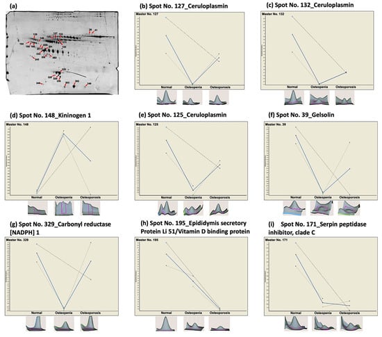 In this study, through a serum proteomics analysis on a population-based cohort of postmenopausal women, we identified 11 protein spot features that were increased, and 16 that were decreased, in serum from patients with OS and OP relative to the normal samples. A total of 12 serum proteins showed differential expression in the presence of OS and OP. Among the identified proteins showing significant changes in expression between NOR, OS, and OP samples, serum levels of CP, GSN, NADPH 1, and SERPINC 1 were usually lower in osteopenia than in the osteoporosis group. However, the opposite was observed for serum protein levels of KNG1, where higher levels were observed in osteopenia. Of these differentially expressed proteins, VDBP showed the most decreased levels in osteopenia and osteoporosis samples. This validation confirmed that the serum levels of these proteins were altered in women with osteopenia and osteoporosis.