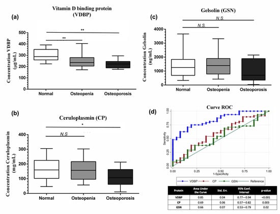 Validation as a potential biomarker. Box-and-whisker plot showing the serum levels of (a) vitamin D-binding protein (VDBP), (b) ceruloplasmin (CP), and (c) gelsolin (GSN) in the Normal, Osteopenia, and Osteoporosis groups after the validation through ELISA. (d) Receiver operating characteristic (ROC) analysis of the three candidate proteins useful as biomarkers. * p < 0.05, ** p < 0.001, N.S Not statistically significant, compared to normal group.