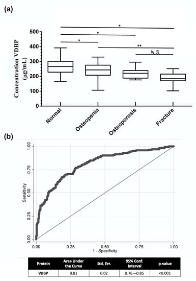 Vitamin D-binding protein is encoded by the GC gene, it is an alpha-2-globulin partially glycosylated that is produced at the liver and has a molecular weight of 52–59 kDa [37]. The best-recognized function of VDBP is to act as a carrier of vitamin D to reach target tissues for maintaining calcium homeostasis through the vitamin D endocrine system. The VDBP can bind with high affinity to 88% of circulating 25-hydroxyvitamin D (25 (OH) D). Moreover, VDBP is able to bind with low affinity to almost 85% of 1, 25-dihydroxyvitamin D (1, 25 (OH) D), the most active metabolite of vitamin D. The remaining fraction of vitamin D is bound to albumin and <1% of vitamin D exists in an unbound form into the bloodstream [37,38]. In the present study, levels of VDBP were significantly lower in serum from postmenopausal women with low BMD (osteopenia and osteoporosis) and fracture. Our results allowed for establishing a cut-off point to discriminate osteopenic/osteoporotic individuals. Based on these results, serum VDBP could have a potential utility as a biomarker for the early detection of osteopenia and osteoporosis.