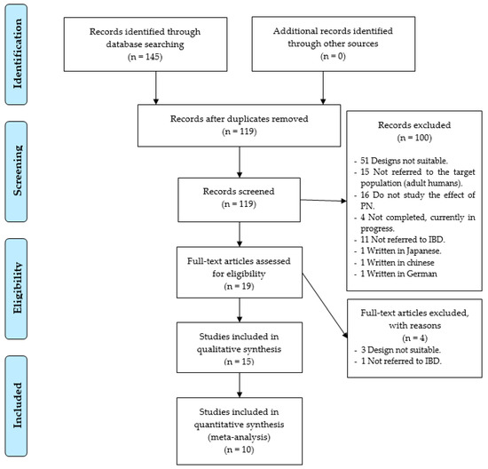 As a result of the specific search equations used on the different databases, a total of 145 records were found of scientific articles. A total of 26 records were duplicated, leaving a total of 119 records without duplication. In the first phase of the study, exactly 100 study records were discarded, leaving 19 full-text studies to review, so that the accuracy was 16%. The reasons for not including them were that 51 records showed that the study utilized a design that was not adequate, 15 did not use an adult population, 16 did not study the effect of PN, three were written in another language other than the ones cited above, (one in Japanese, one in Chinese, and one in German), 11 did not refer to the IBD, and four were still being conducted without showing results (Figure 1).