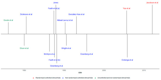 As for the designs of the studies included, 11were controlled and randomized clinical studies (73.4%), two non-randomized, controlled clinical trials (13.3%), and two non-randomized, non-controlled clinical trials (13.3%) were found. In addition, six of the studies found showed results that specifically referred to CD, one study to UC, and 11 studies had results on UC and CD, under the category of IBD. Also, 10 studies mentioned the results of the disease in its active form and five studies report disease outcomes in patients under surgery. Figure 2 shows this information in a chronological manner.