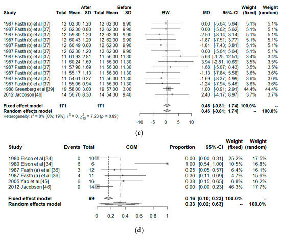Forest plot for: (a) Crohn’s Disease Activity Index (CDAI), (b) Albumin, (c) Body weight (BW), and (d) Postoperative complications (COM).