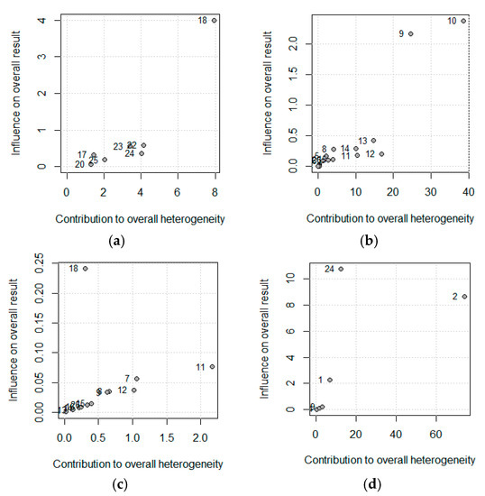Baujat plot for (a) Crohn’s Disease Activity Index (CDAI), (b) Albumin (c) Body Weight, and (d) Postoperative complications. The correspondence between the study and the number is shown in Table 2 (Id, Omitting).