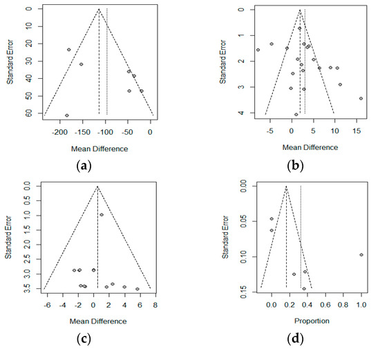 Funnel plot for: (a) Crohn’s Disease Activity Index (CDAI), (b) Albumin (c) Body Weight, and (d) Postoperative complications. The correspondence between the study and the number is shown in Table 2 (Id, Omitting).